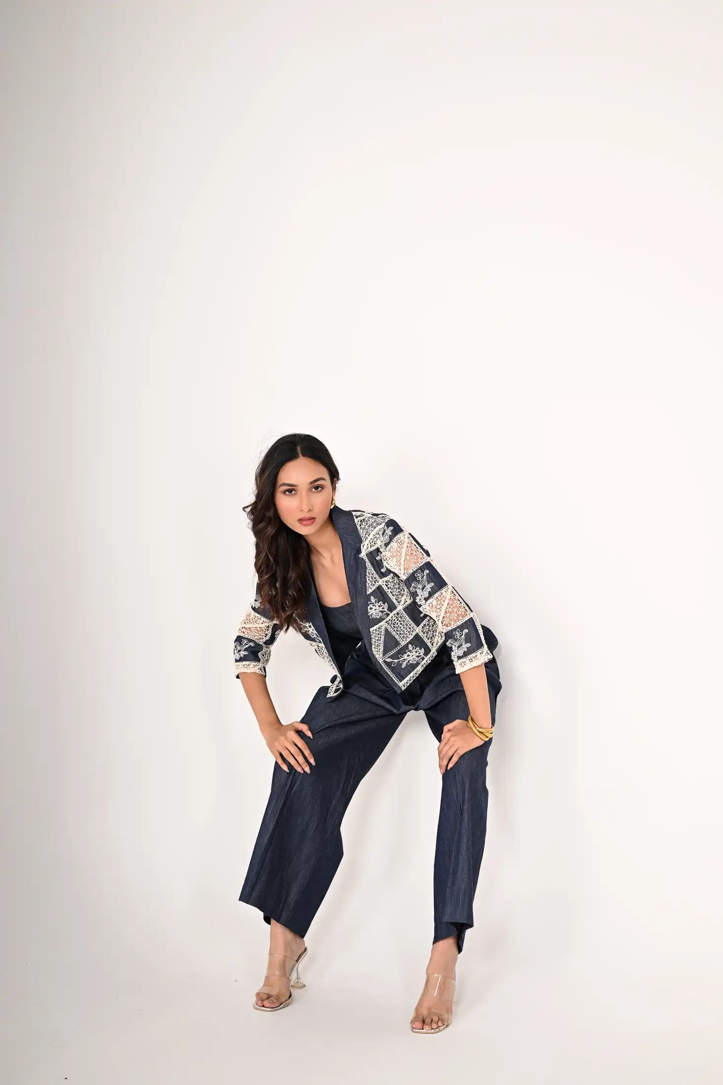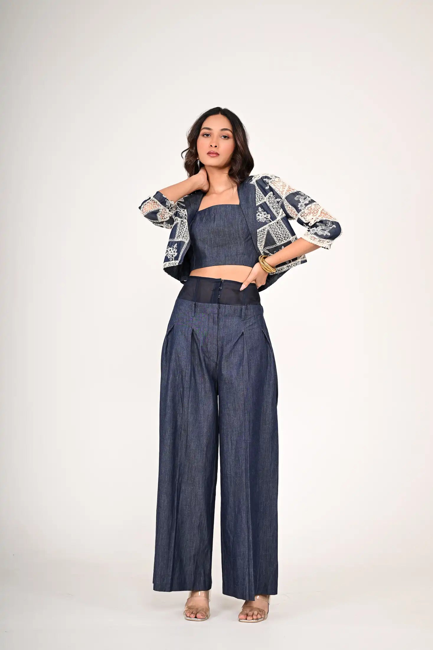 3 pc Set - The denim feel and crochet jacket features a lapel collar and three-quarter sleeves with a inner. It comes with a wide legged high waist pleated pant