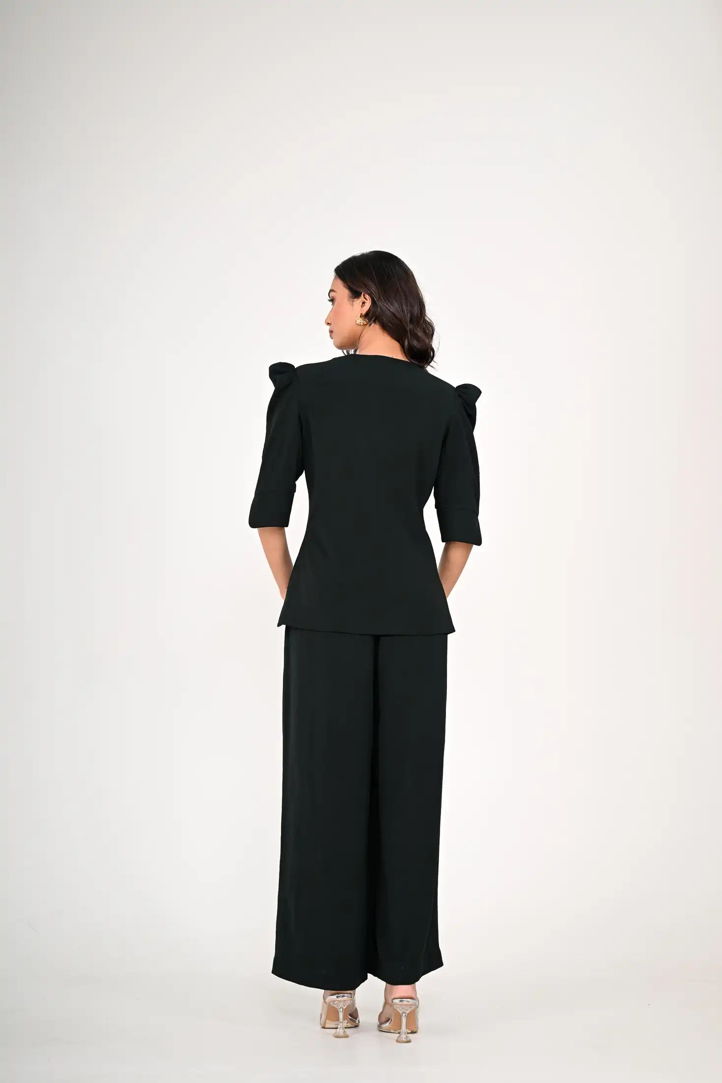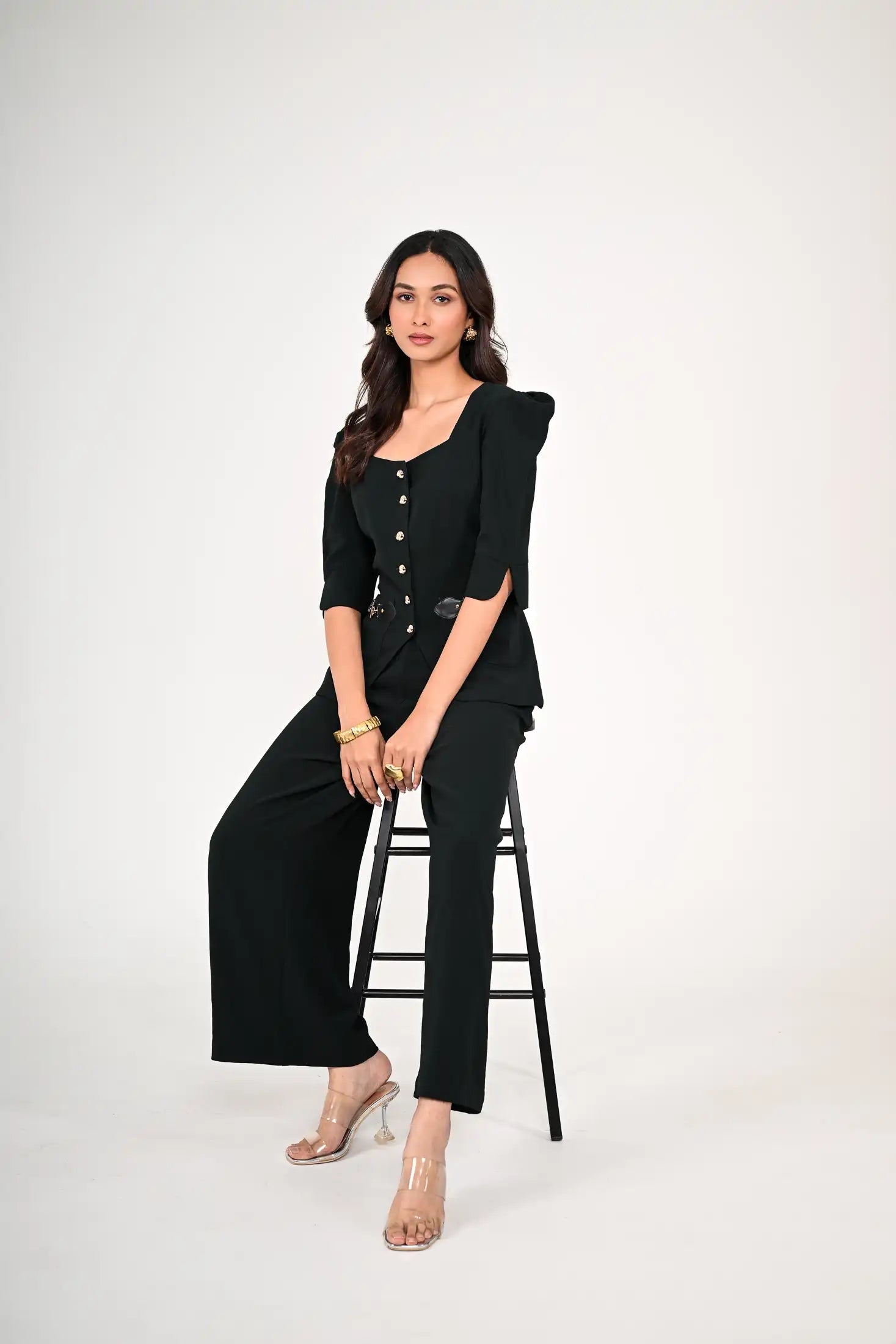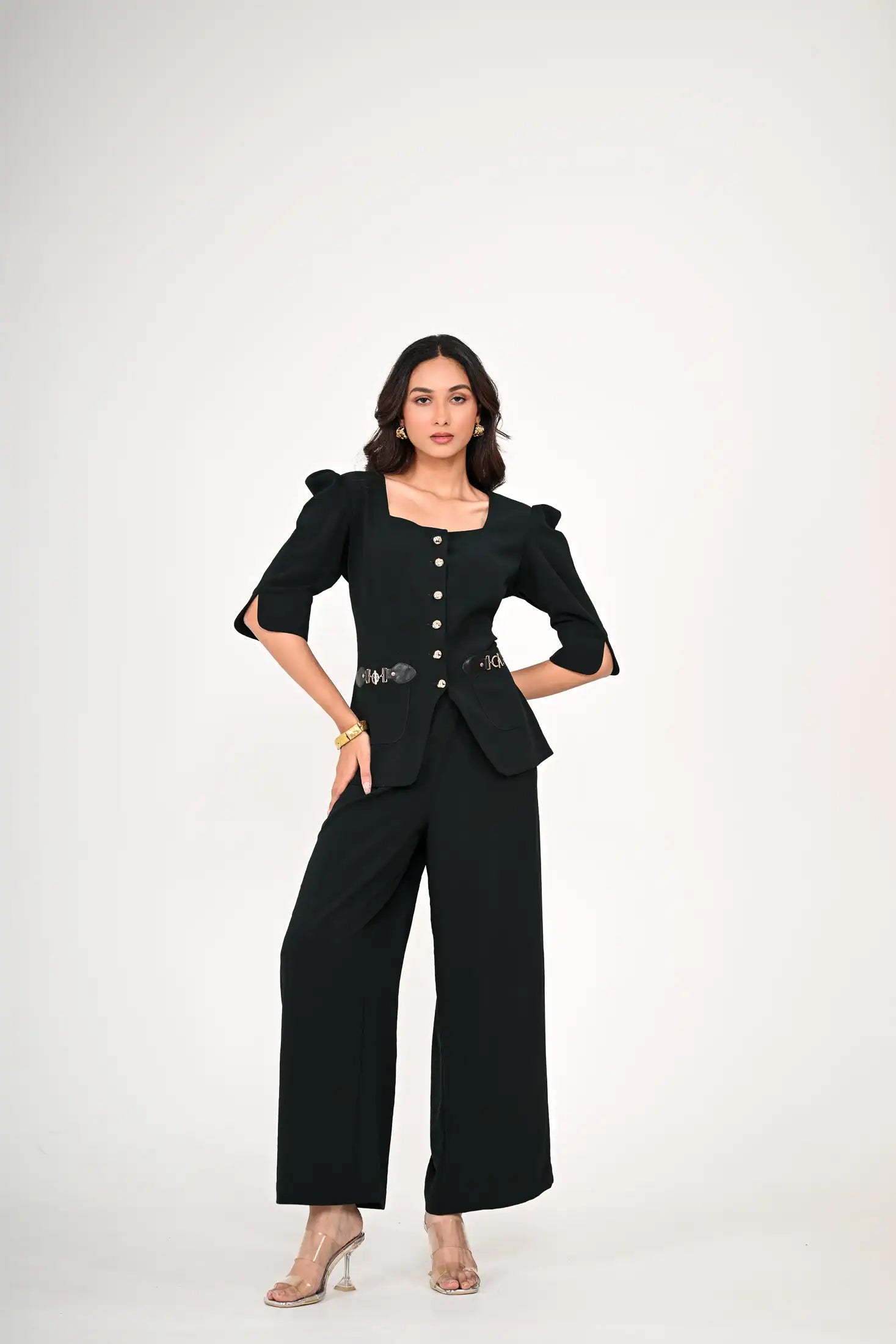 Top features a square neckline, short puffed sleeves, and button detailing down the front, cinched at the waist. The trousers are high-waisted and straight cut.
