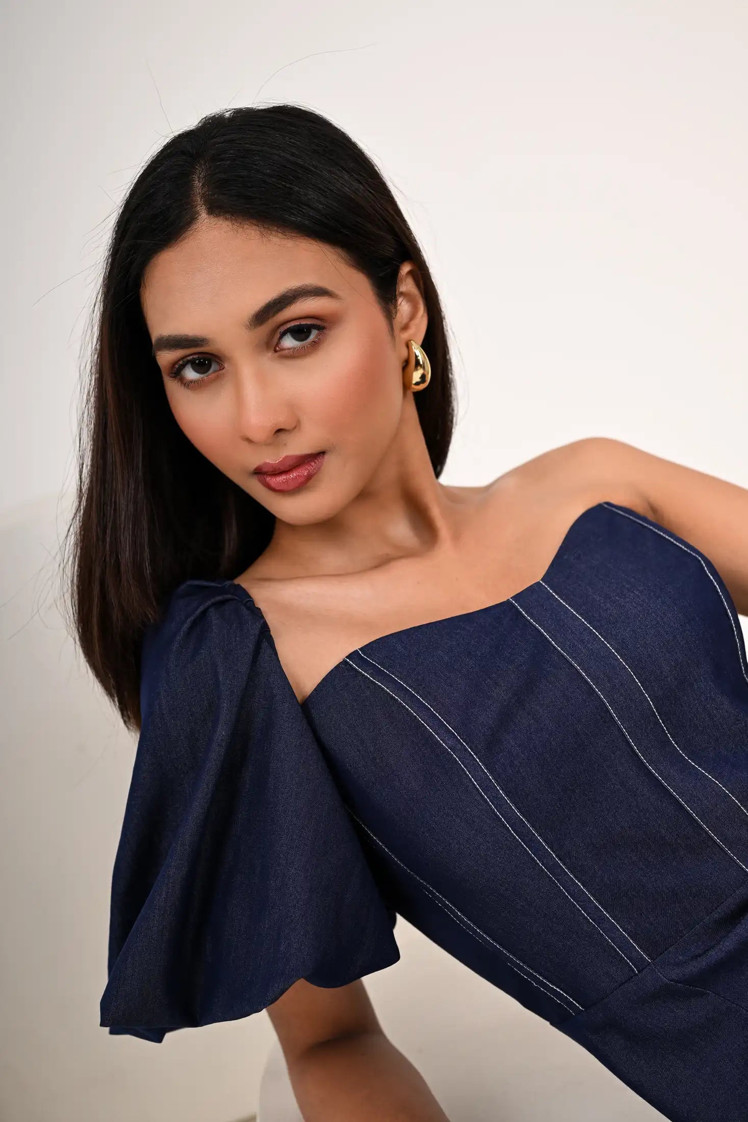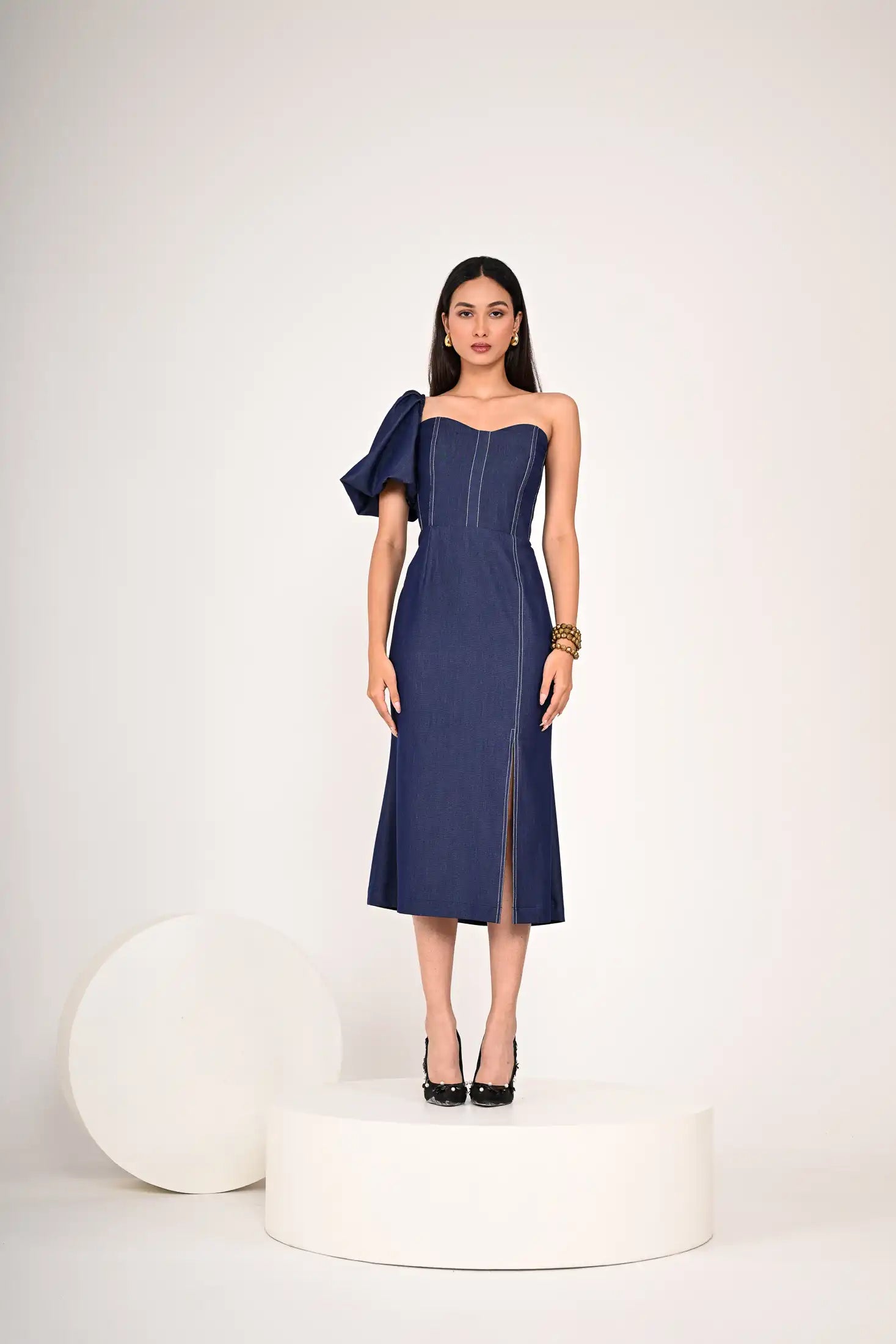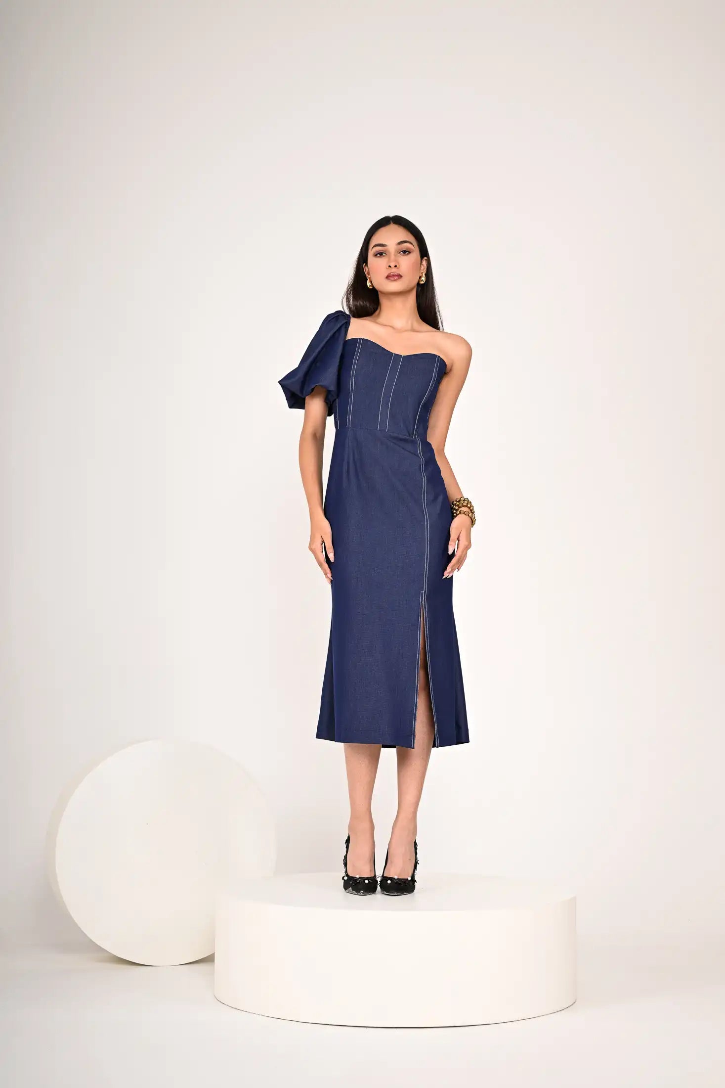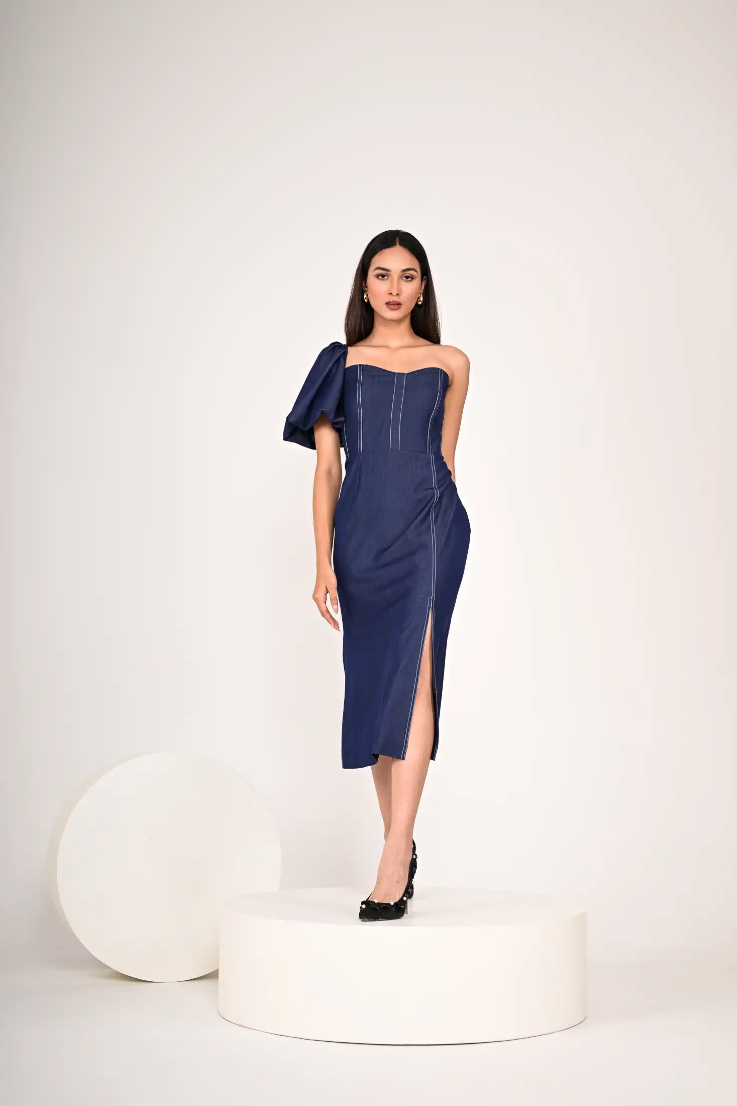 One-shoulder design with a puff sleeve on the right side and a fitted bodice with vertical white stitch detailing , defined waistline and a pencil skirt silhouette with a slit on the left side.
