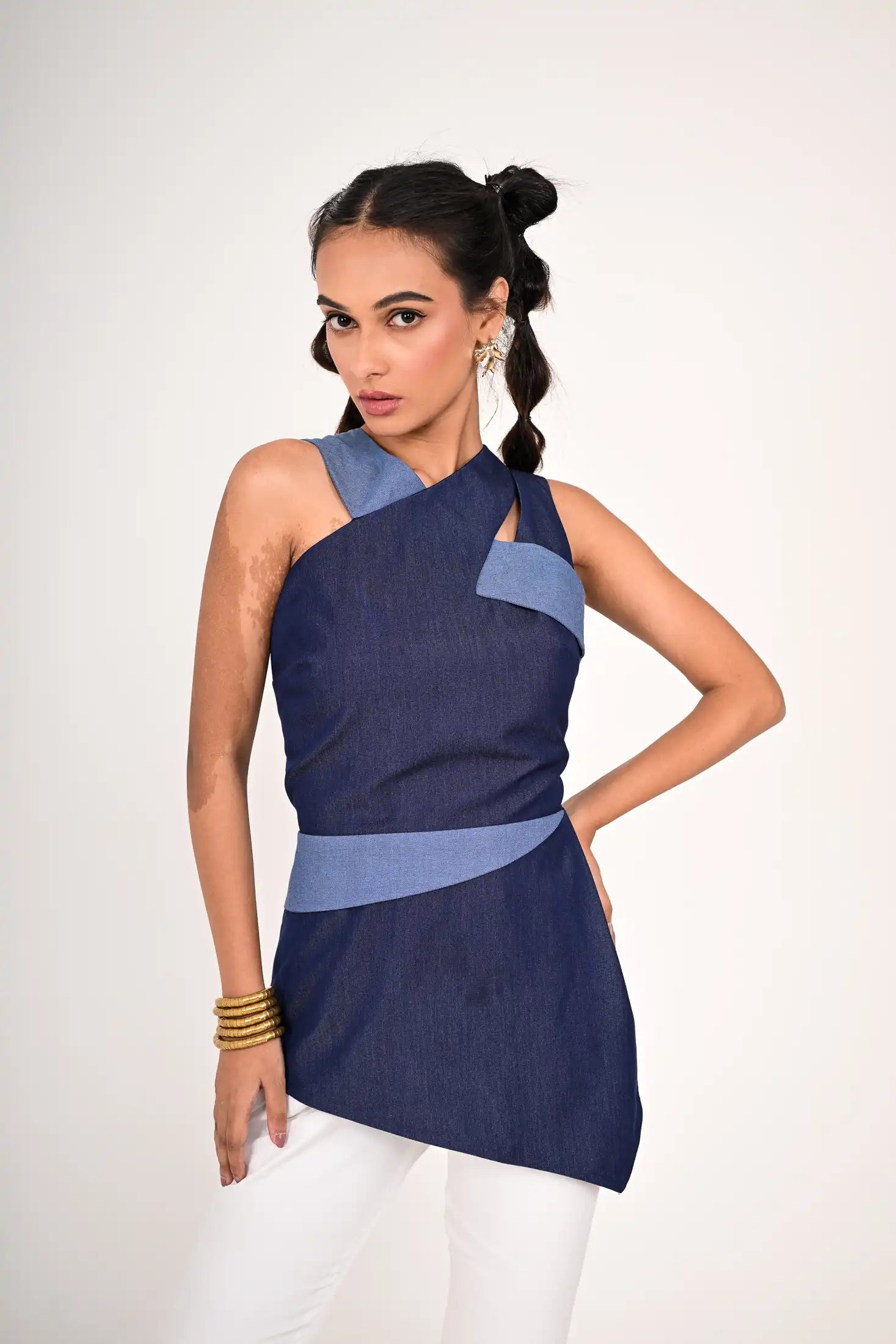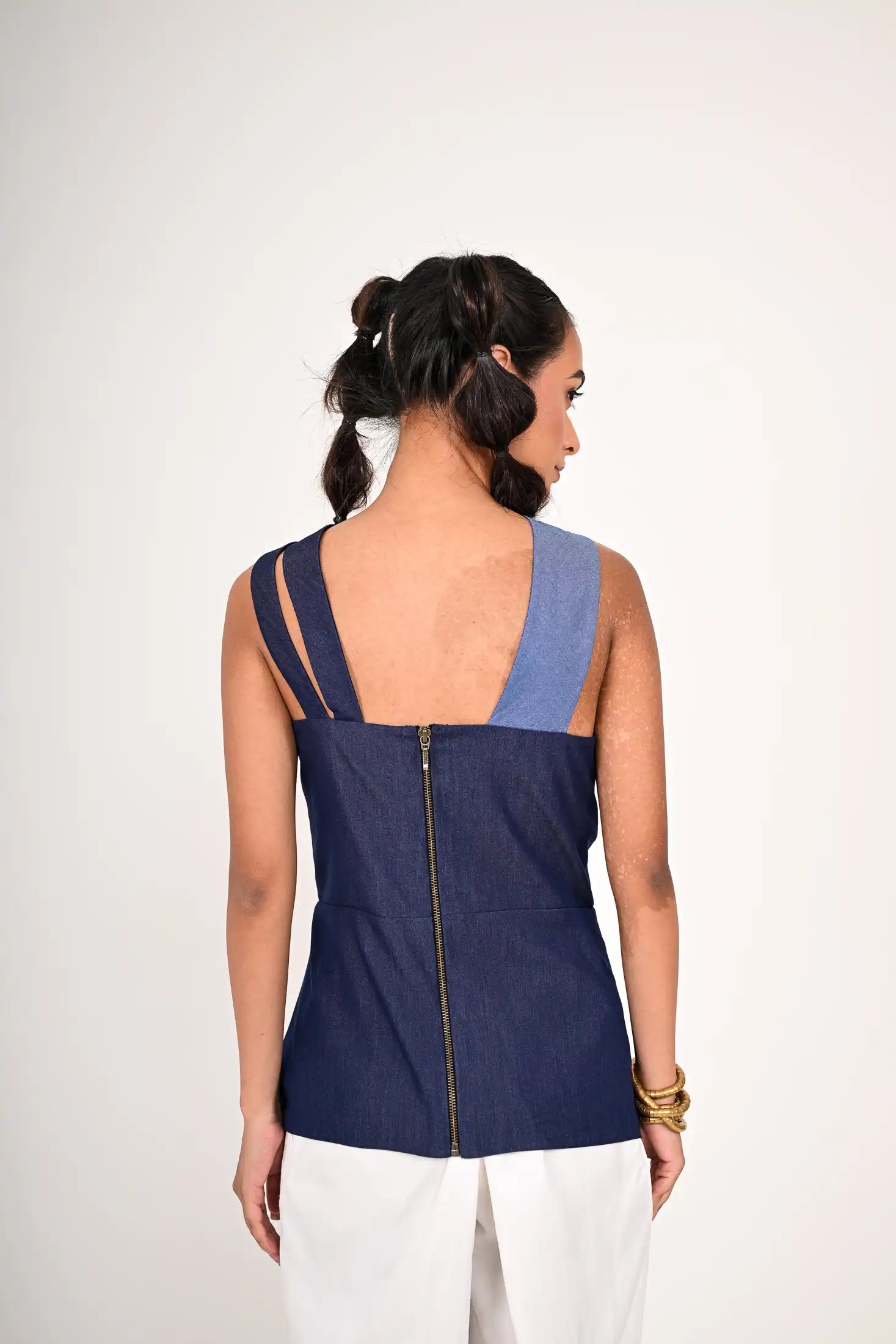 Dark blue fabric with lighter blue accents at the shoulder and waist.