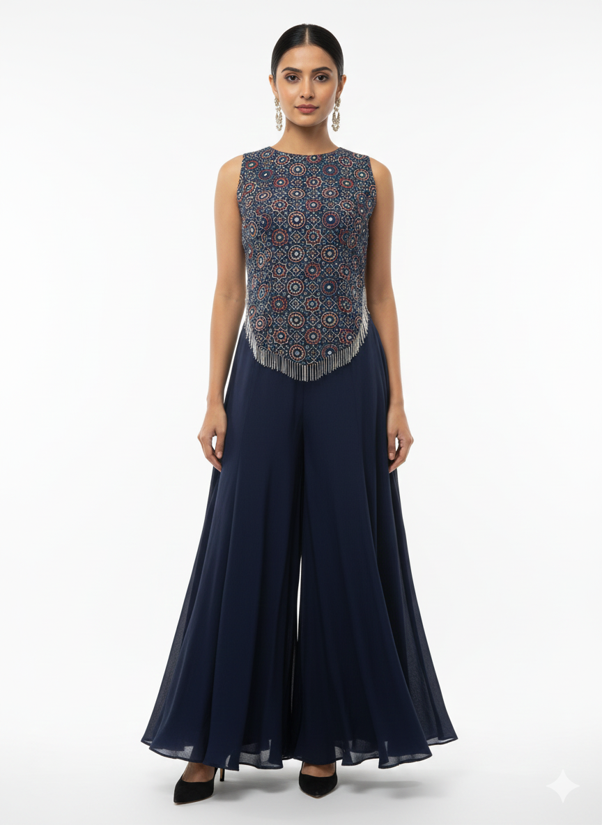 Ajrakh set - 2 pc - high neck sleeveless top with sharara pants