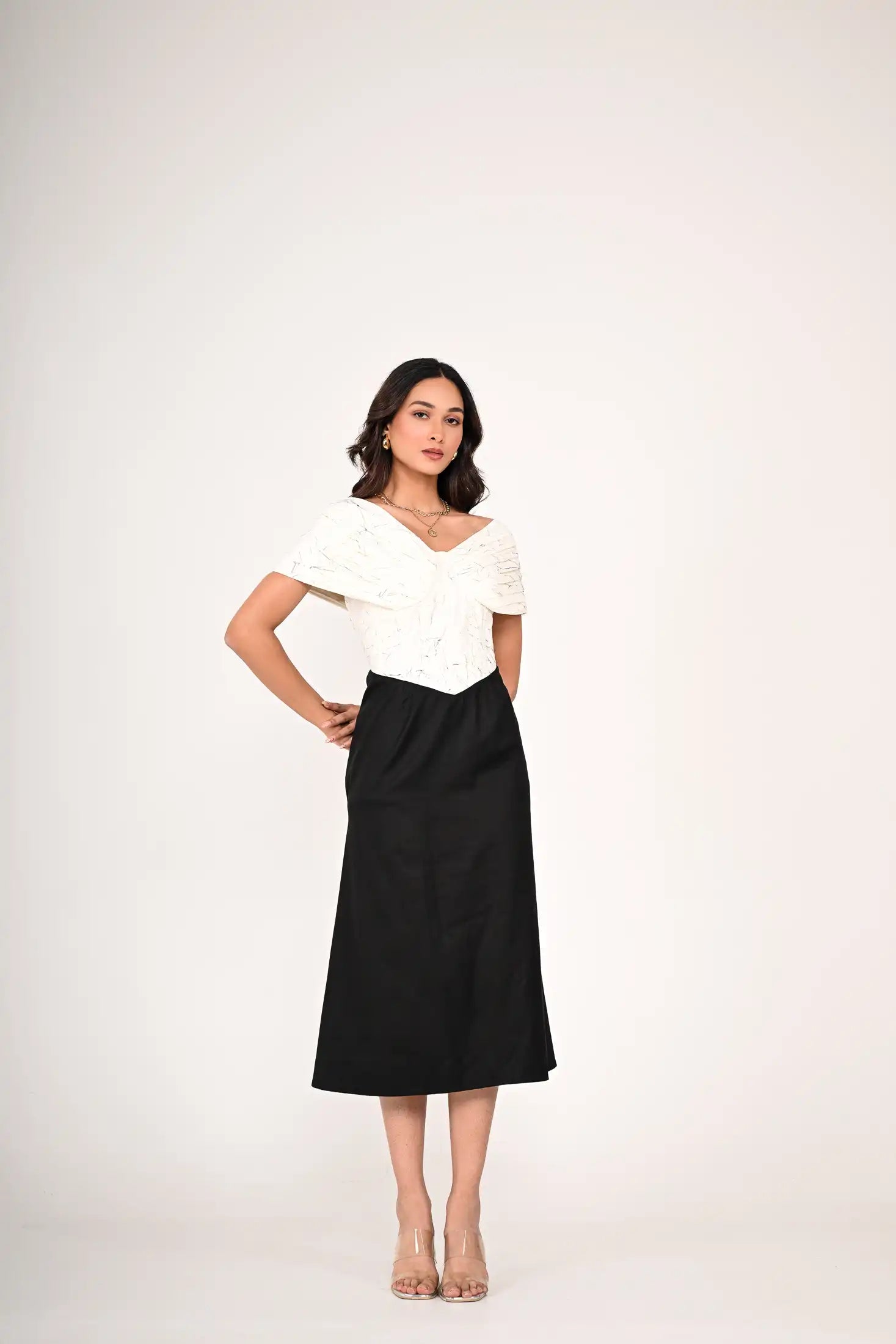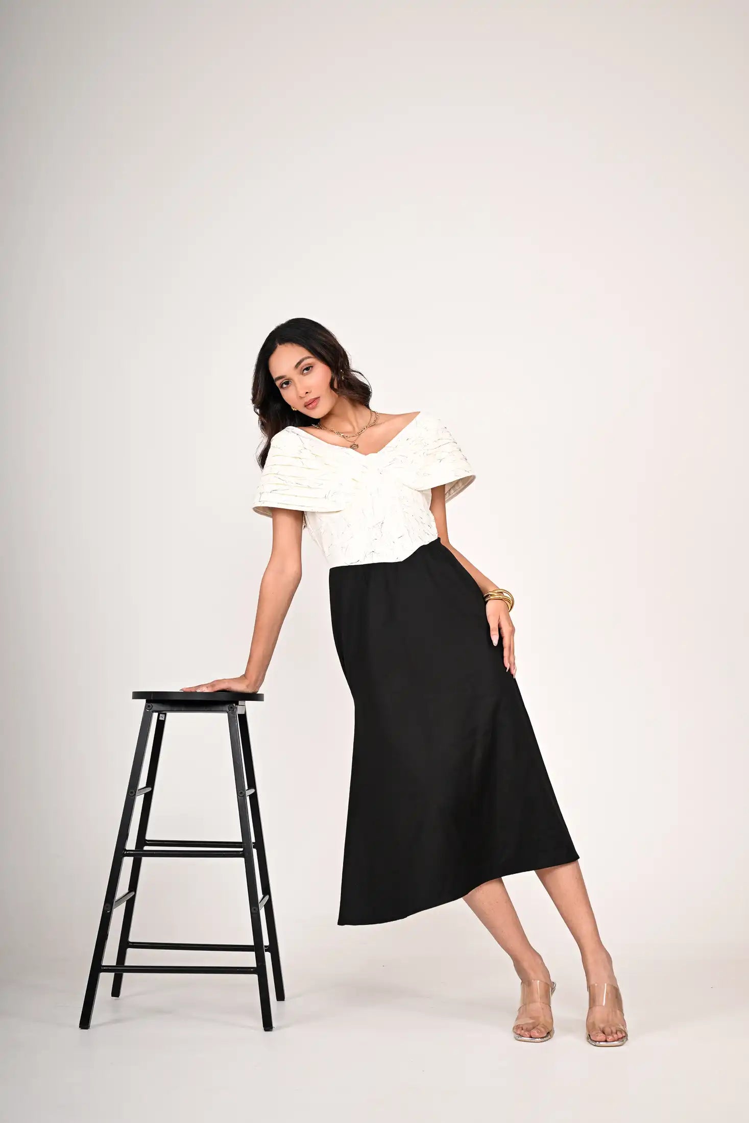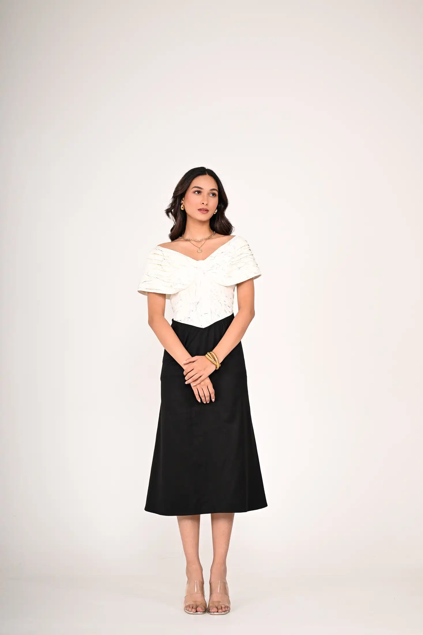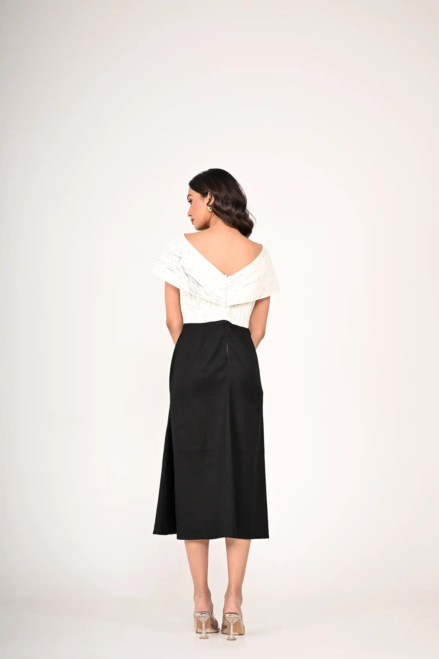 Dress features an off shoulder white textured print fabric on the yolk with a plain black midi length lower part