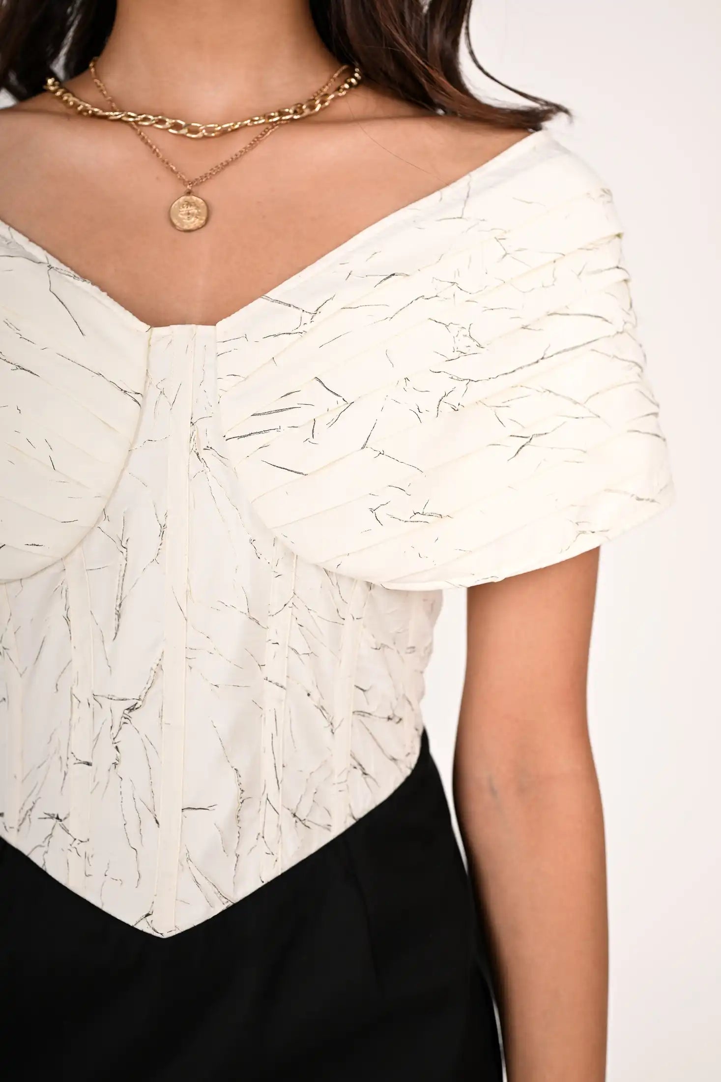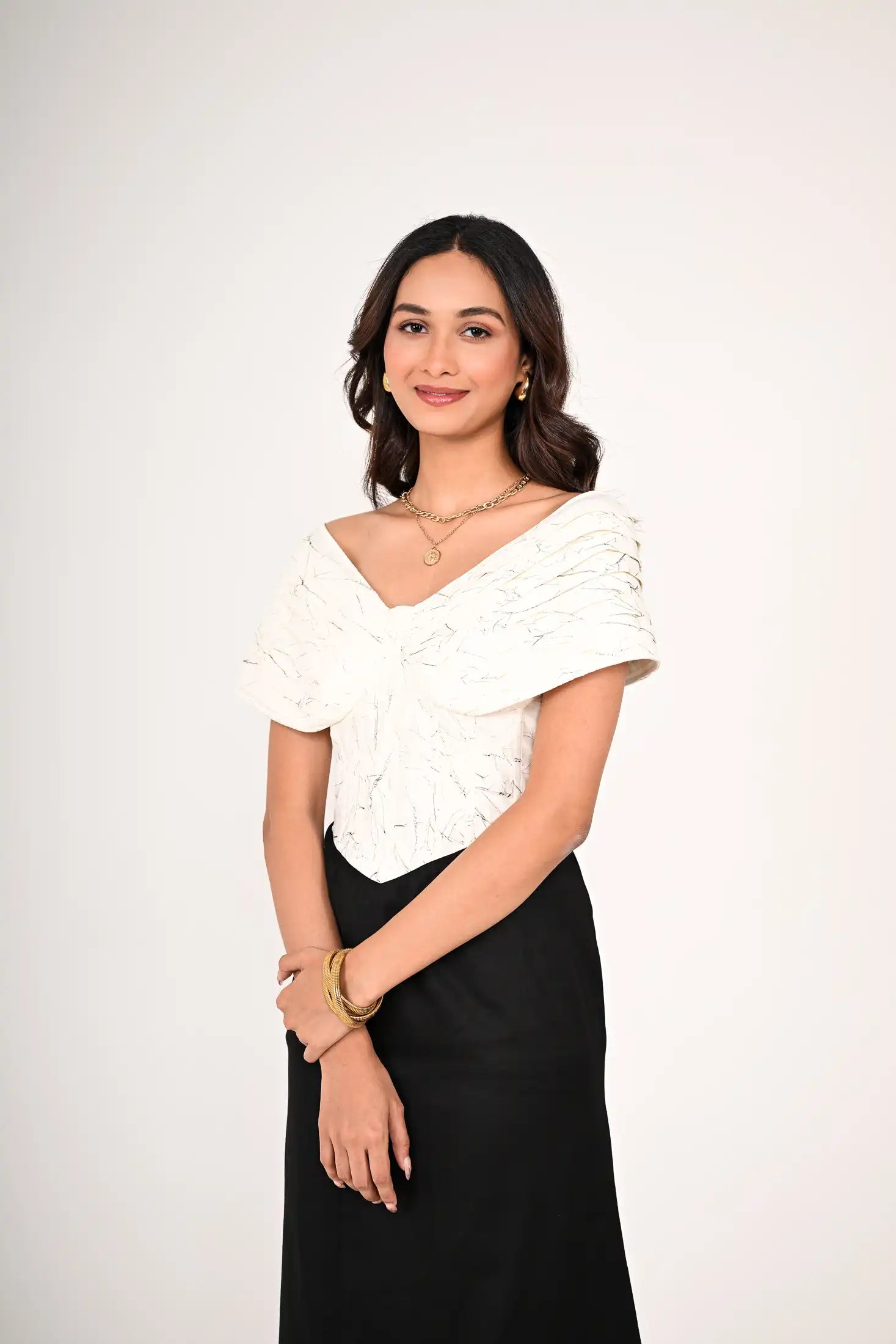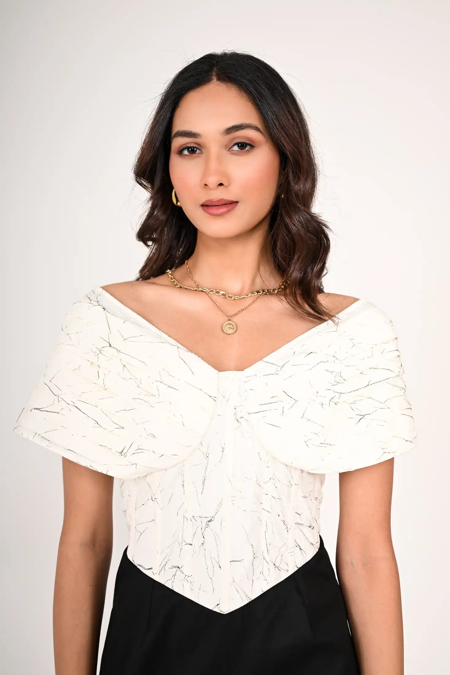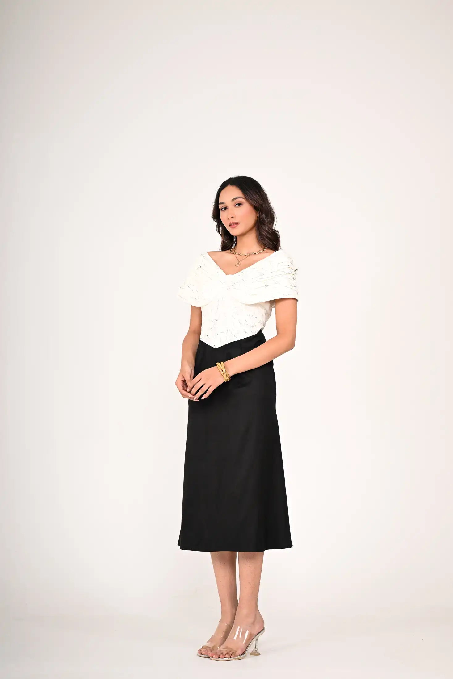 Dress features an off shoulder white textured print fabric on the yolk with a plain black midi length lower part