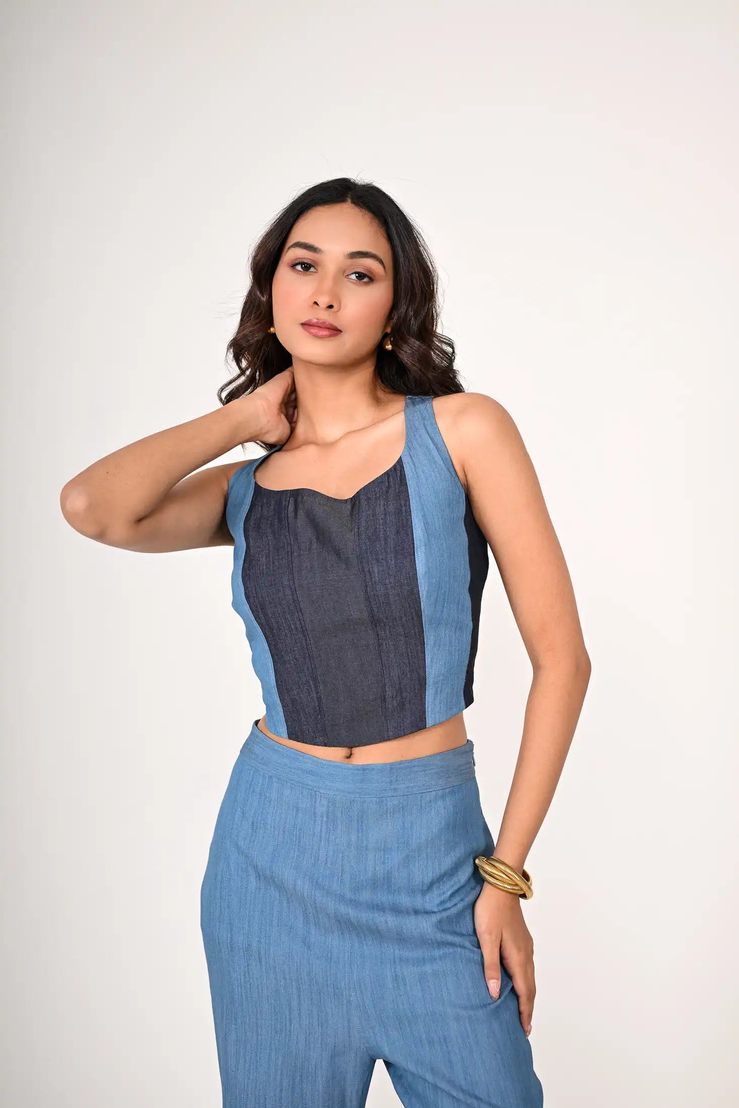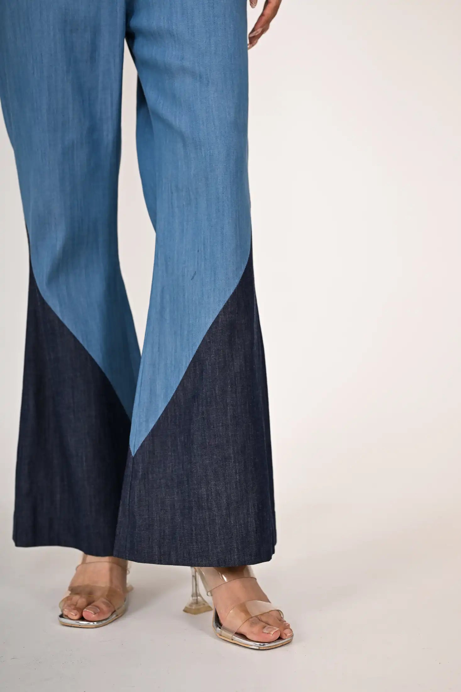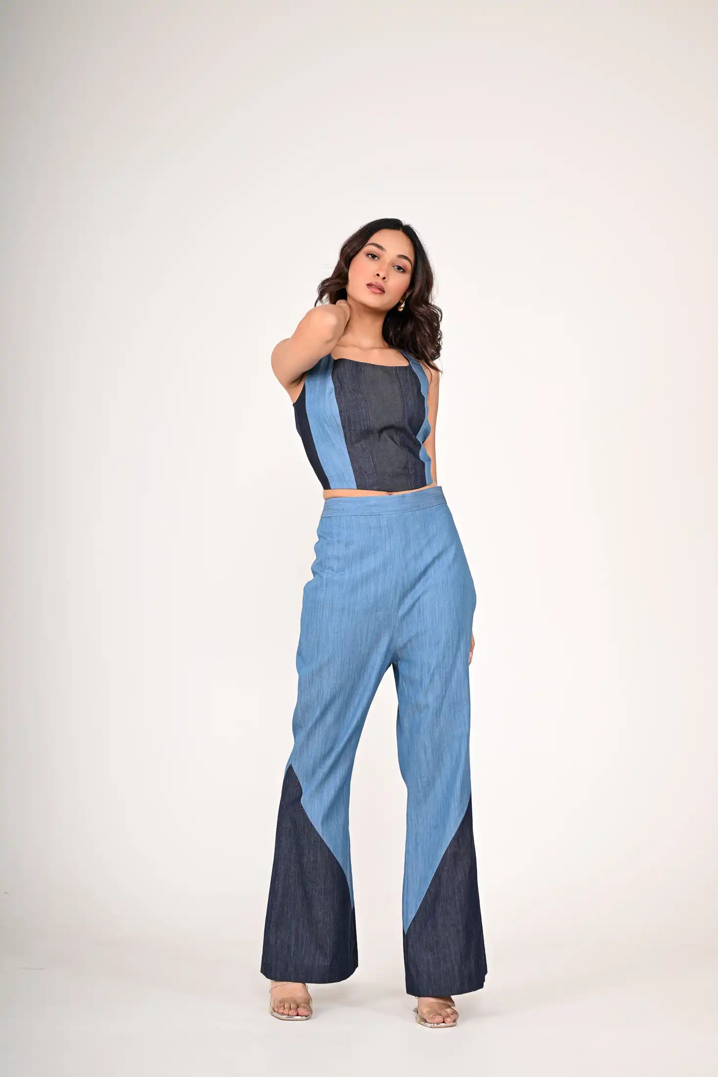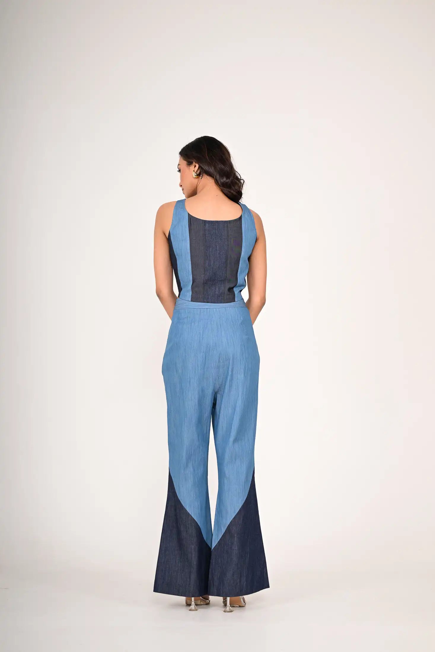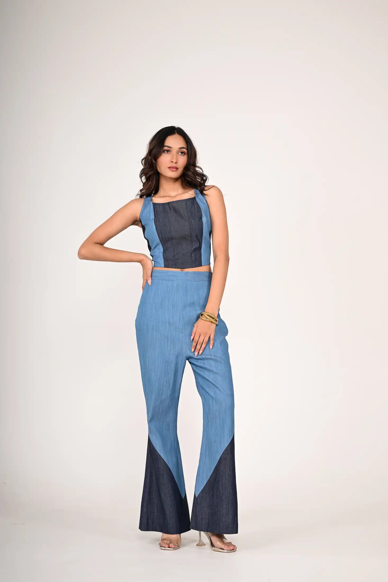 2 pc Set - Denim Color Block Sleeveless Crop Top With Denim Color Block Flared Pants.